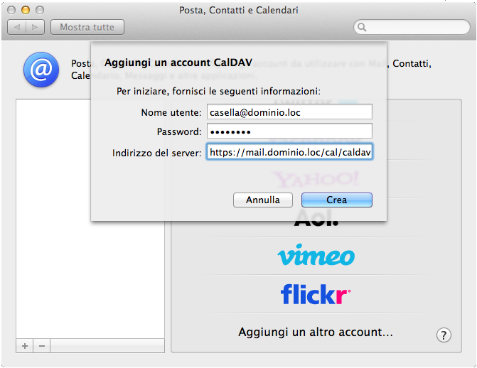 Per collegarsi ad una rubrica tramite il protocollo CalDAV , è possibile configurare una nuova rubrica CalDAV tramite "Posta, Contatti e Calendari" presente in "Preferenze di Sistema".